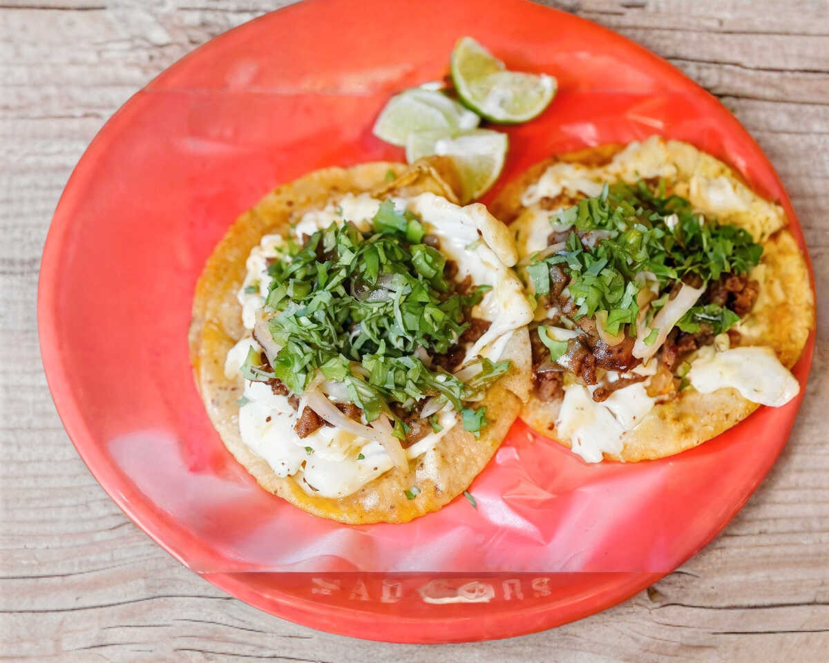 Doble tortilla de maíz, chorizo, cilantro y cebolla frita.