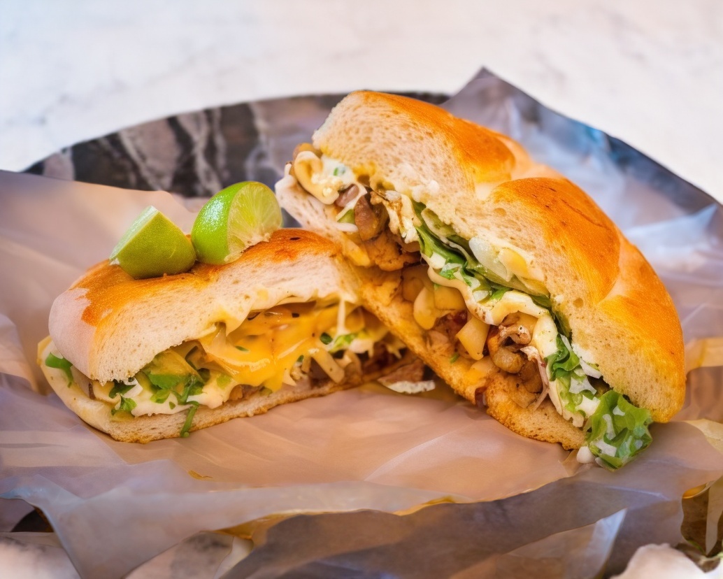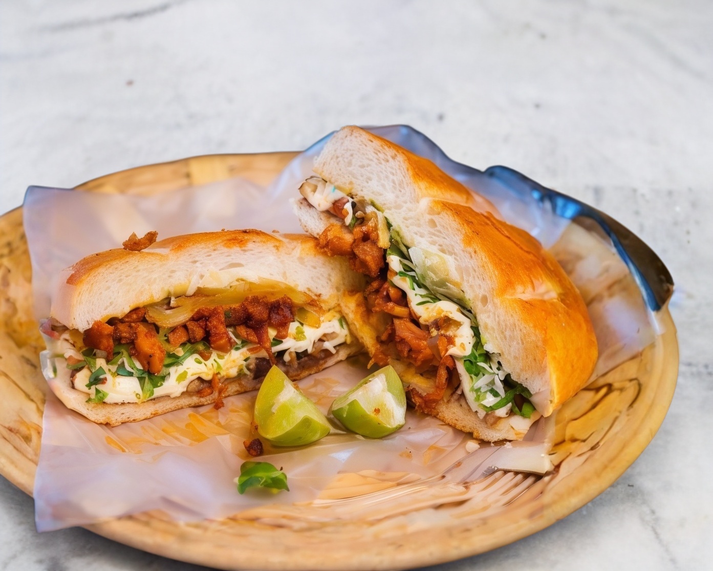 Pan de telera, frijol, mayonesa, cilantro, col, cebolla frita, quesillo gratinado con chorizo