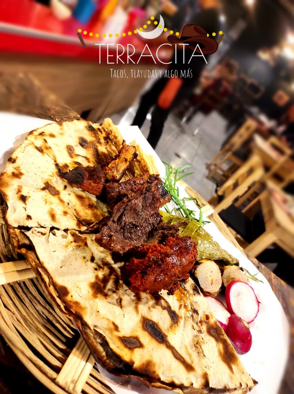 Tlayuda con asiento, frijol, quesillo gratinado aguacate rebanado con pieza de carne asada de su elección.