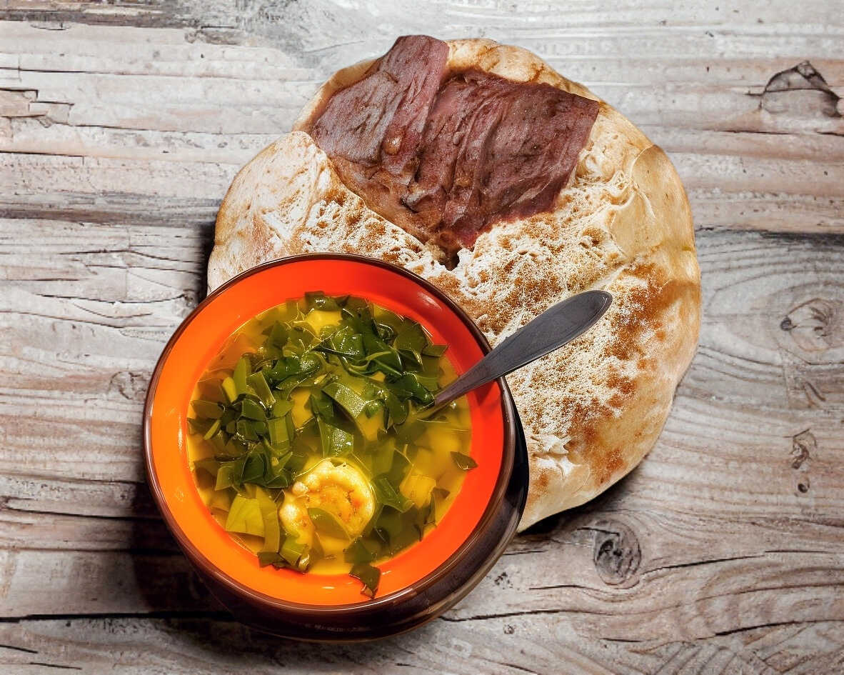 Riquisimo caldo de guías acompañadas de una tlayuda con asiento, quesillo gratinado y la pieza de carne de su elección