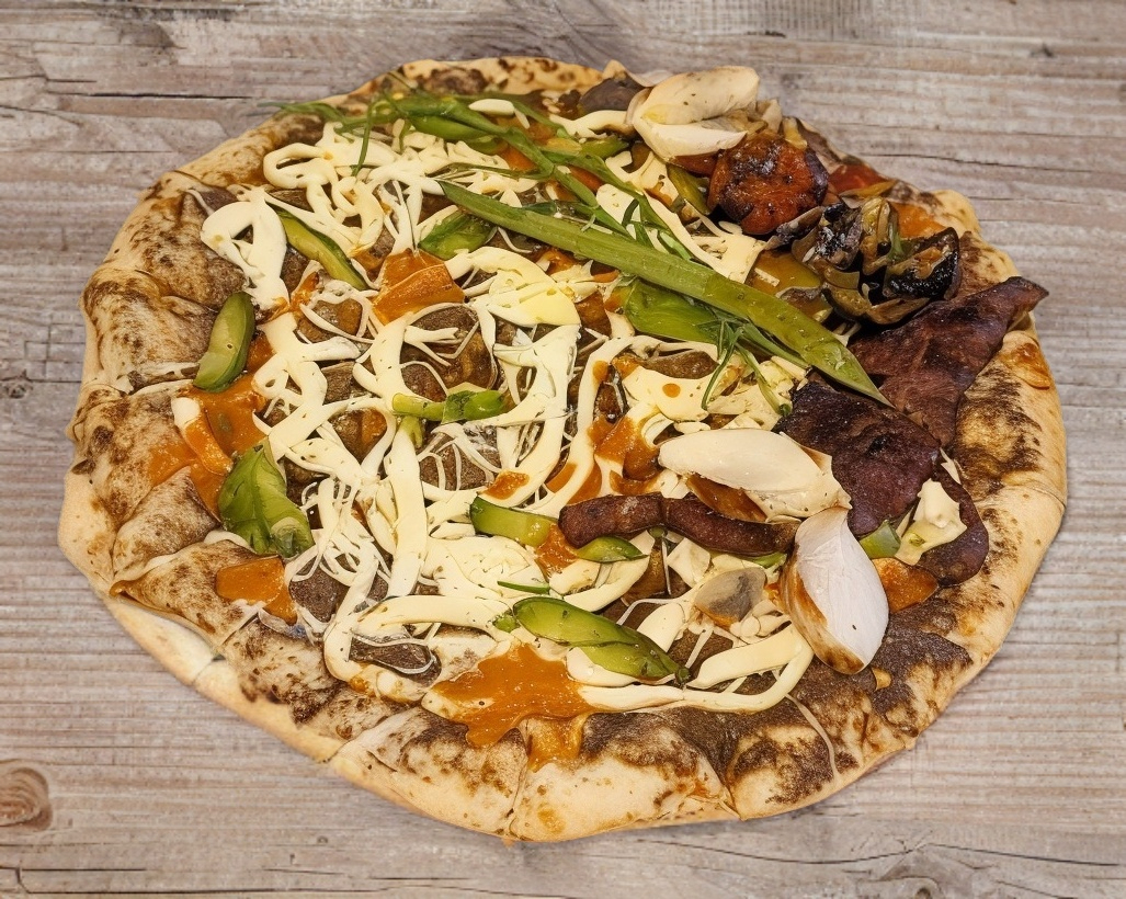 Tlayuda con asiento, frijol, col, quesillo de crema gratinado con chapulines y la pieza de carne de su elección asada al carbón
