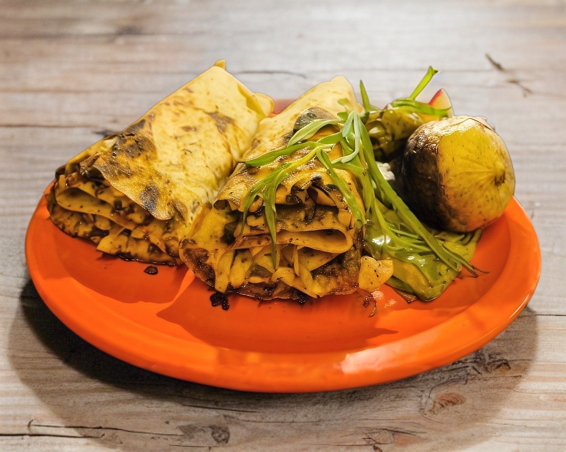 Tlayuda enrollada tipo taco dorada al carbón con asiento, frijol, quesillo gratinado, cilantro, cebolla frita y carne frita de su elección.