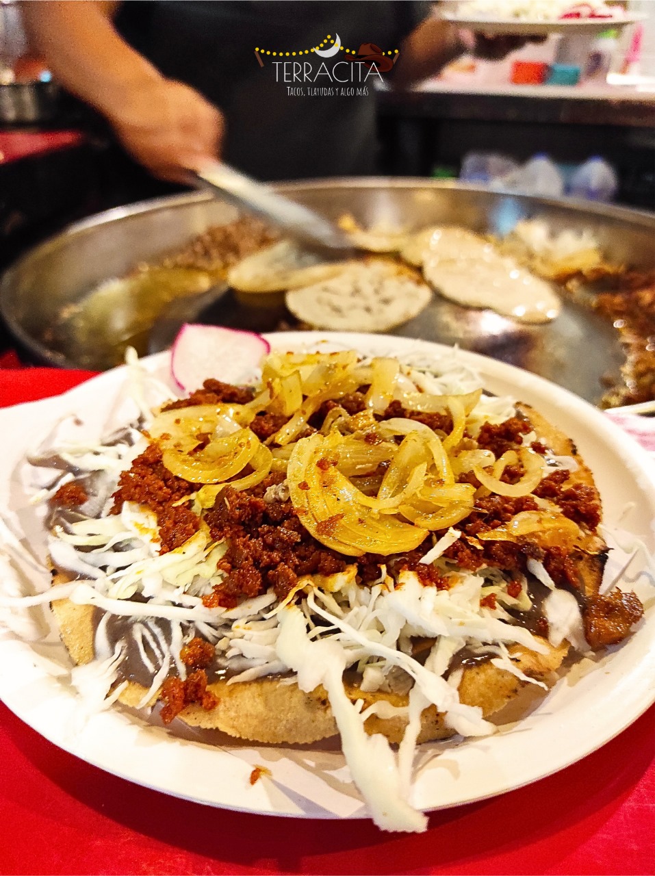Tostada frita con frijol, col, chorizo, cebolla frita acompañada de rabanos.