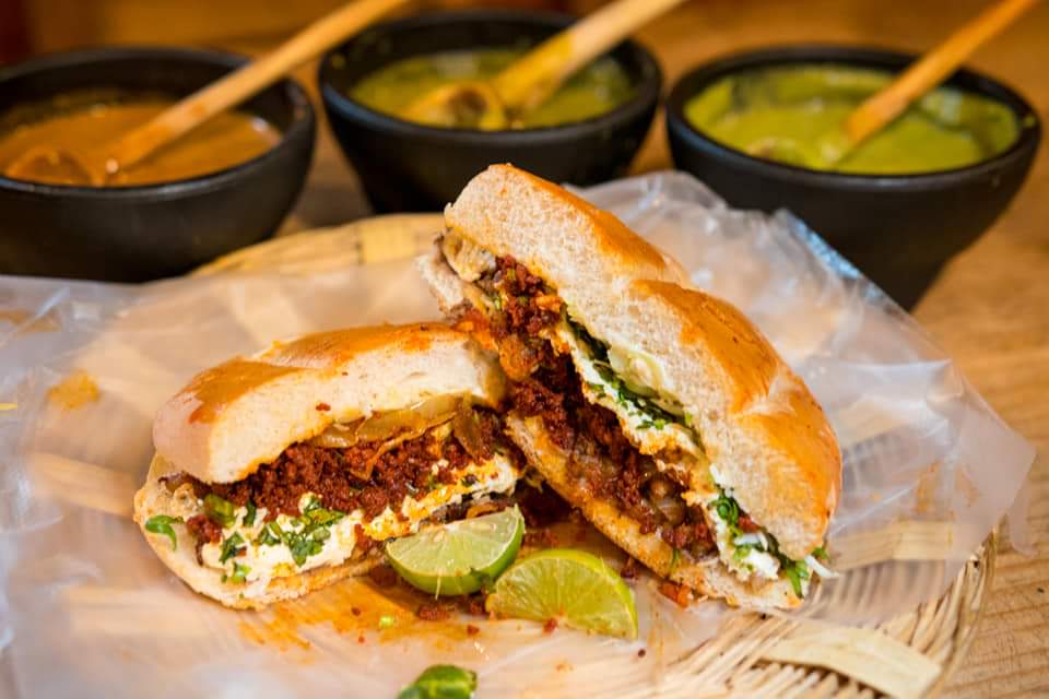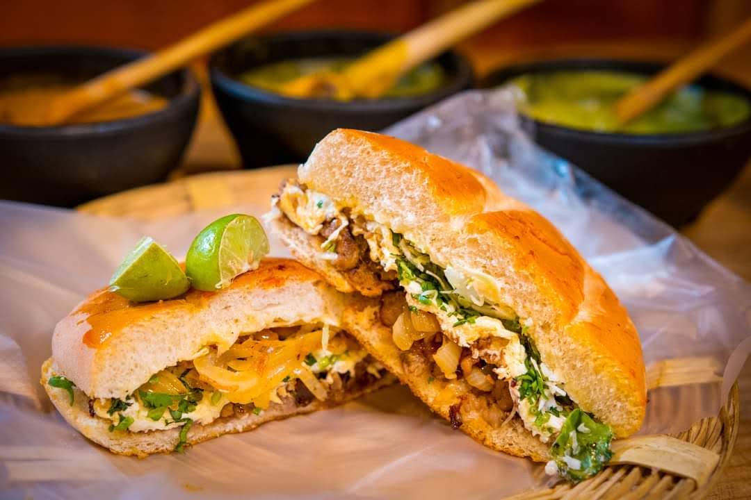 Pan de telera, frijol, mayonesa, cilantro, col, cebolla frita, quesillo gratinado con carne campechana (tripa, tasajo, costilla y chorizo)