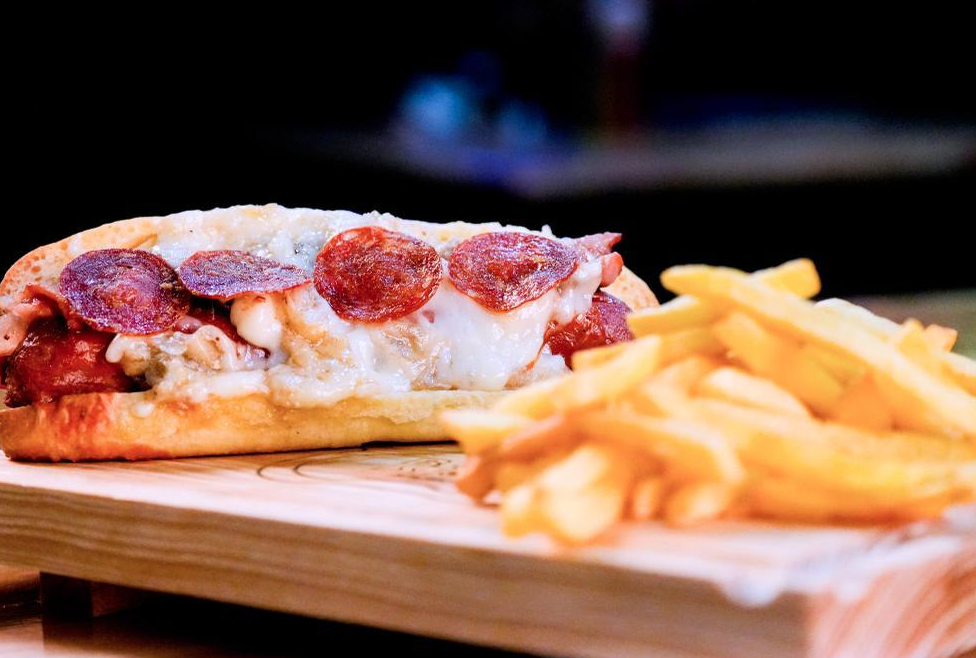 Delicioso hot dog con salchicha, aderezo, queso mozzarella y pepperoni.