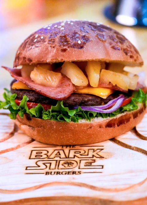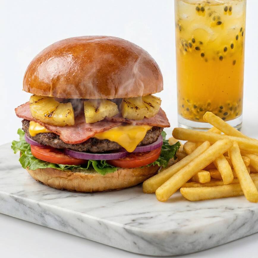 Deliciosa hamburguesa con carne de res, queso americano, piña, tocino, cebolla morada, jitomate, aderezo mango habanero y lechuga.
