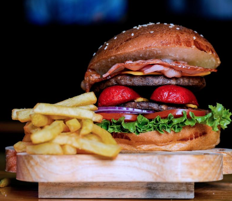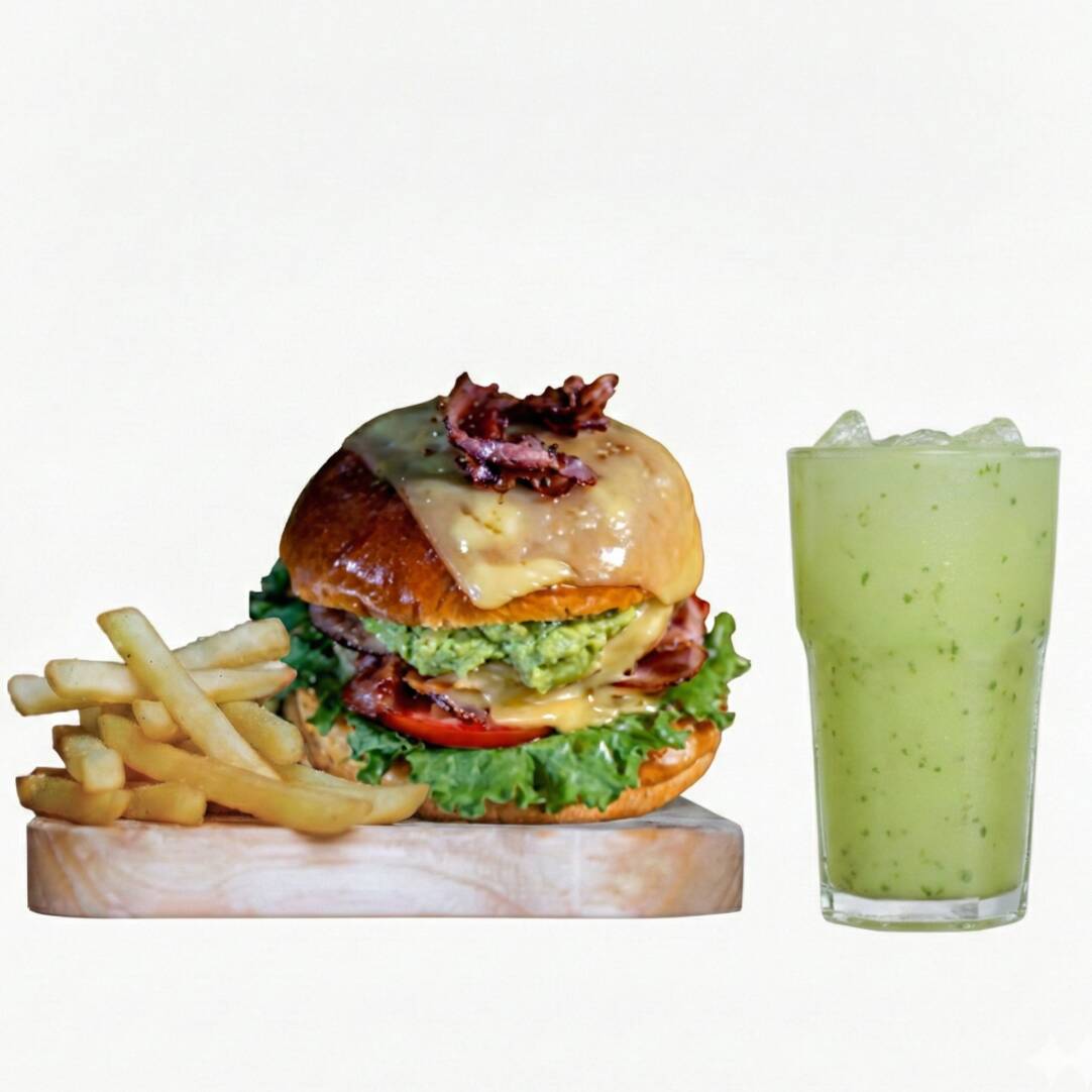 Deliciosa hamburguesa doble carne de res, tocino por dentro y por fuera, doble queso manchego, chiles toreados, guacamole, mayonesa, lechuga y tomate