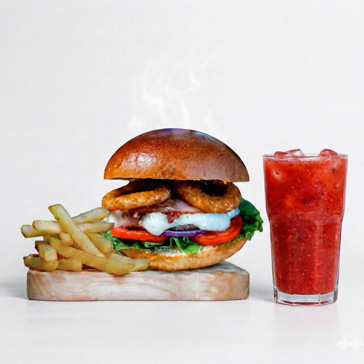 Deliciosa hamburguesa con carne de res, queso mozzarella, salsa BBQ, aros de cebolla, tocino, jitomate y lechuga.