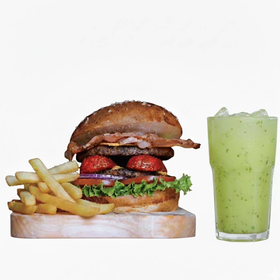 Deliciosa hamburguesa doble carne de sirloin tipo smash, pan artesanal brioche, espinacas baby, doble queso americano, tocino en trozo y aderezo especial de la casa.