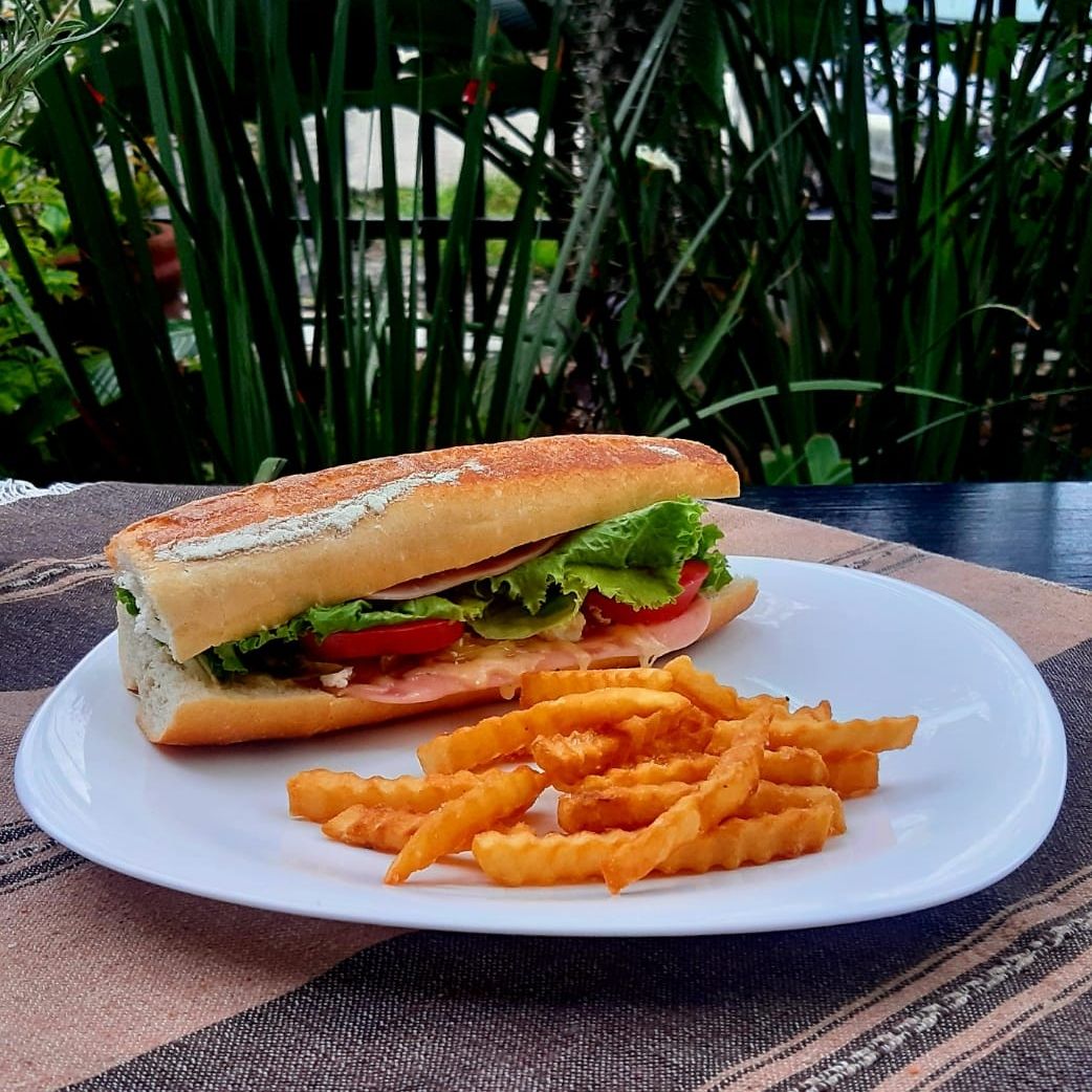 Jamón, manchego, lechuga, tomate, chile y cebolla.