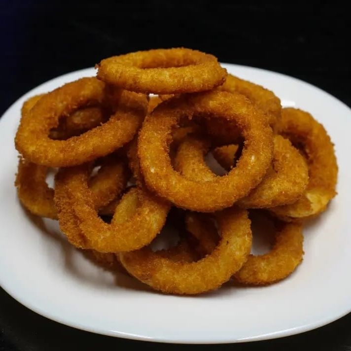 Aros de cebolla empanizados fritos.
