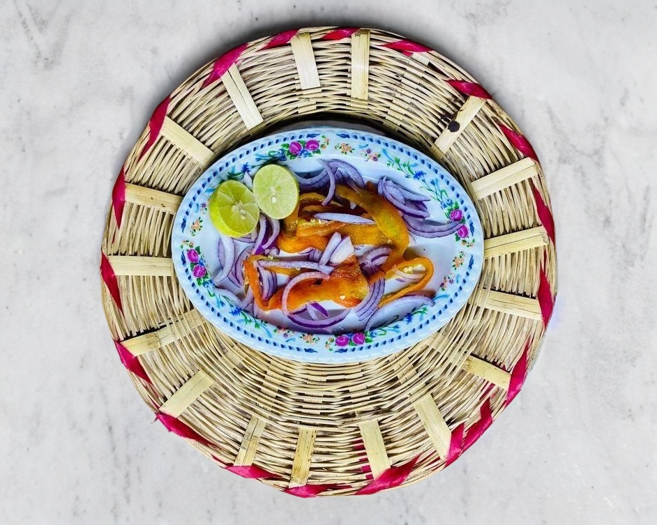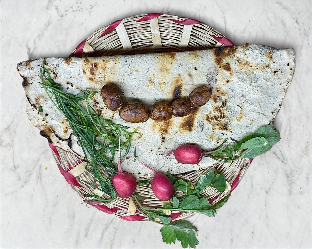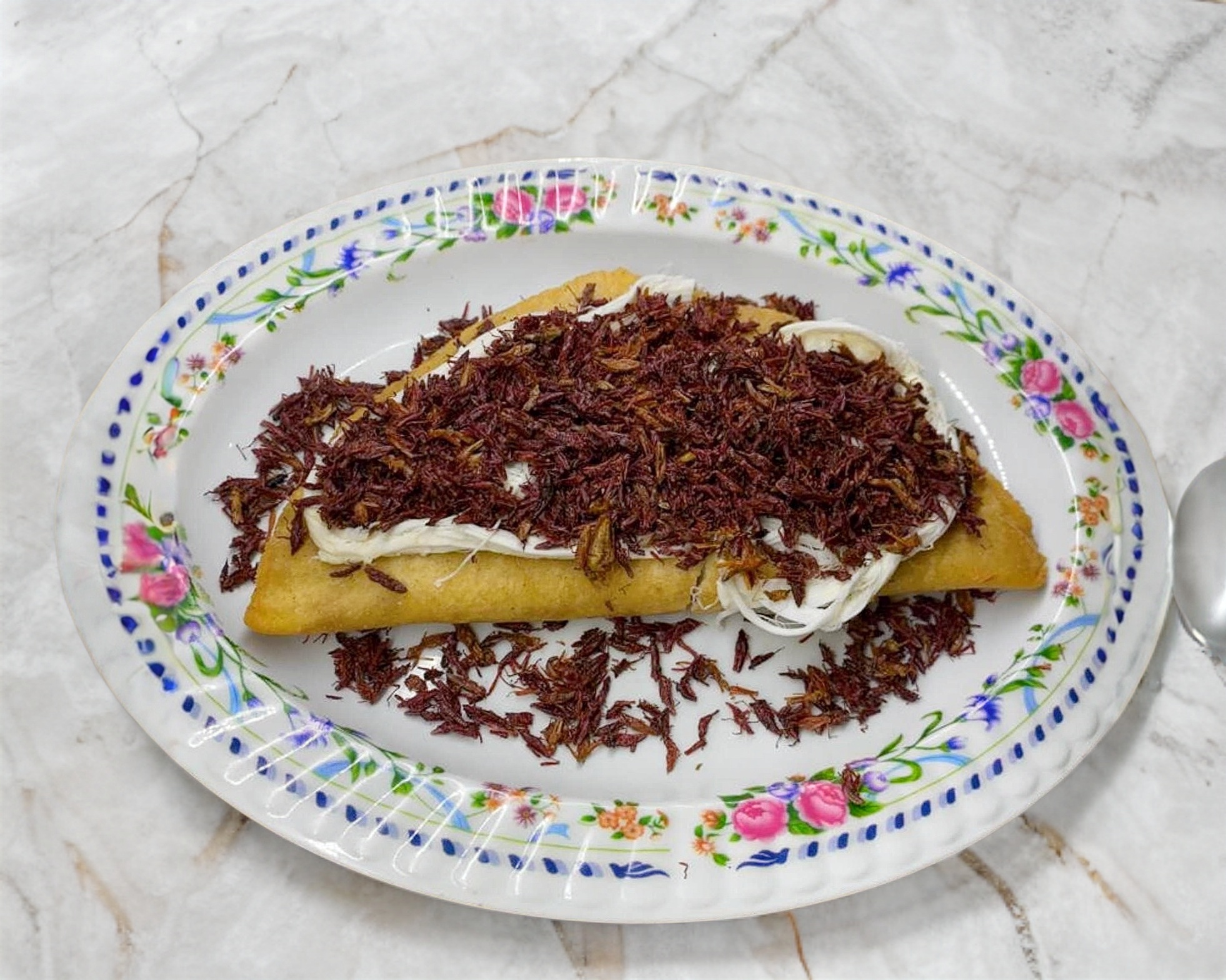 tortilla gigante (tlayuda) base aciento, frijol, verdura, quesos y chapulines