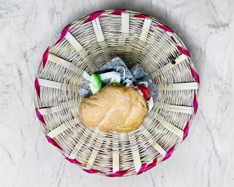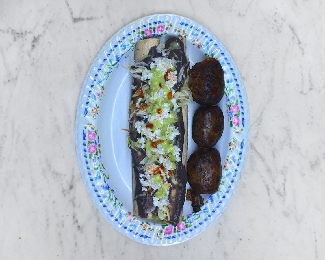 Pan bolillo, con base frijol, mayonesa, carne, y verduras