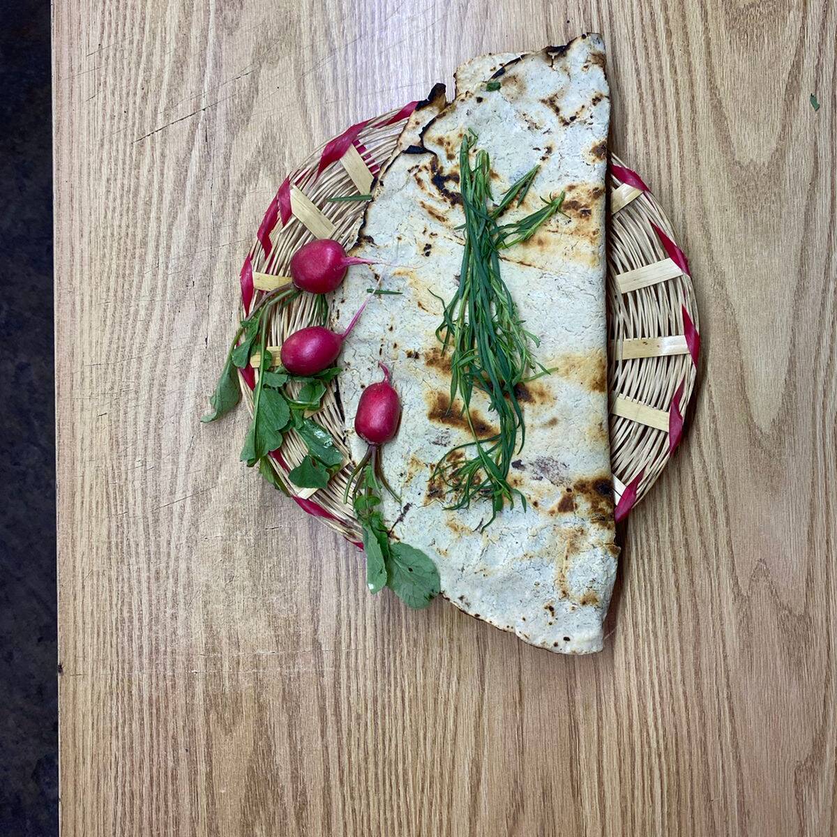 Tortilla gigante (tlayuda) base aciento, frijol verdura y quesos