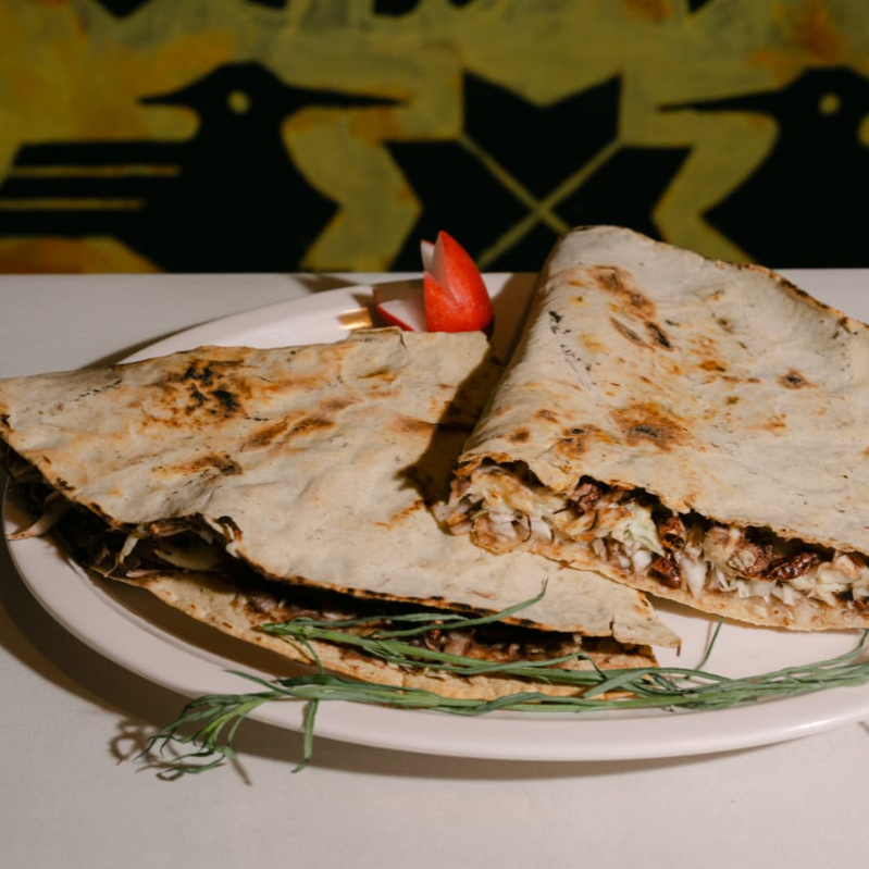 Tortilla doblada acompañada de asiento, frijoles, quesillo y Chorizo