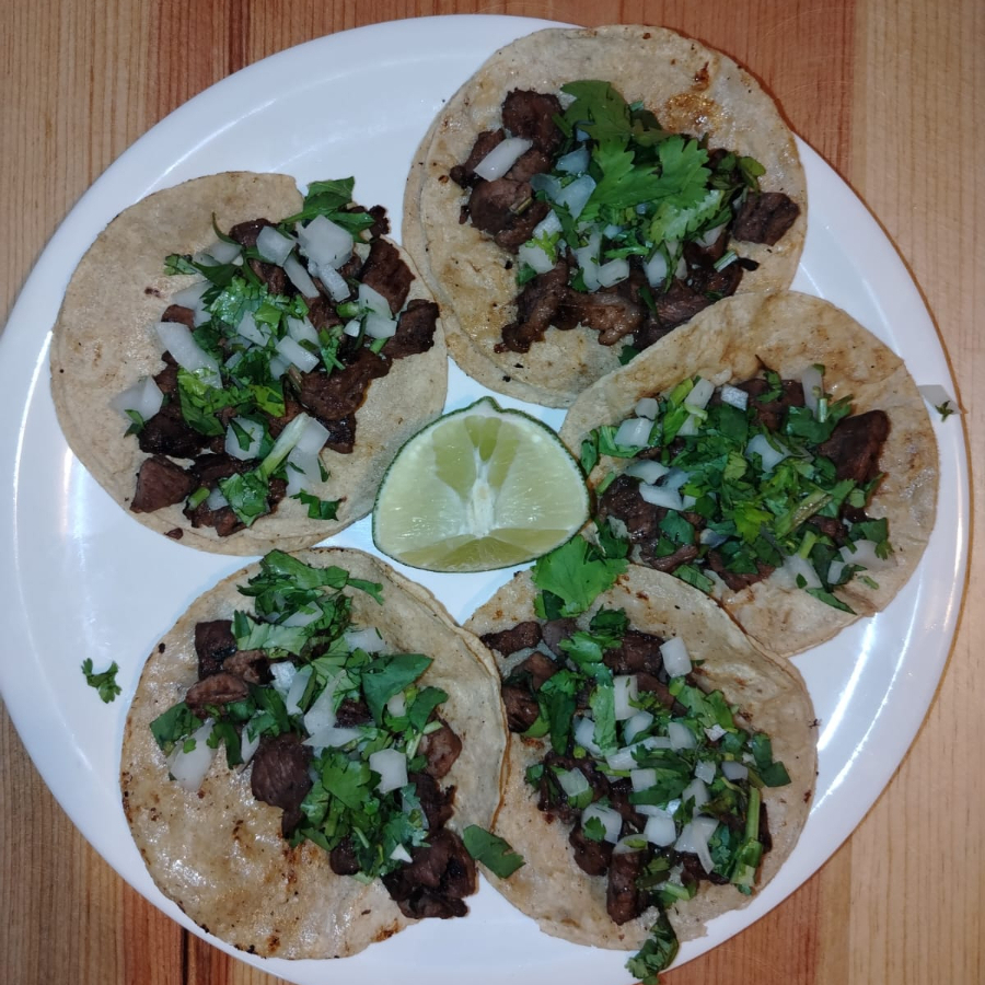 Tacos de maíz con arrachera, cebolla y cilantro
