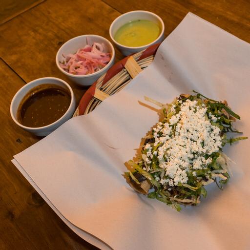 Tortilla de maíz, aciento, frijol, verdura, quesillo y orden de chorizo.