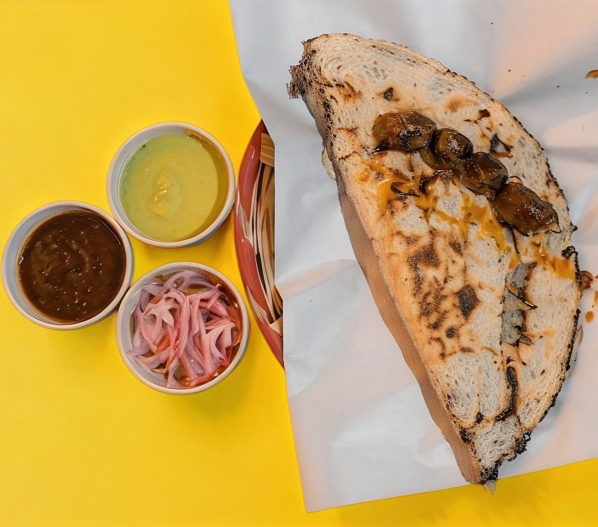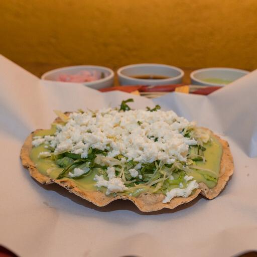 Tortilla de maíz frita, guacamole, verdura y queso fresco.