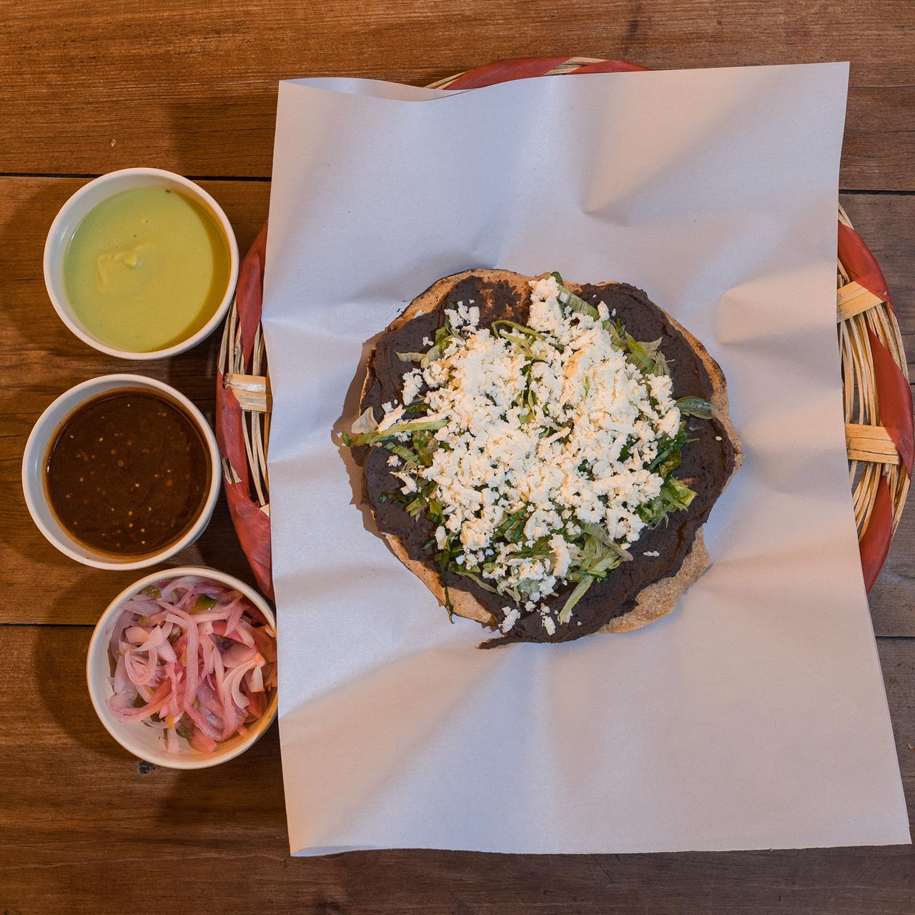 Tortilla de maíz frita, frijol, verdura y queso fresco.