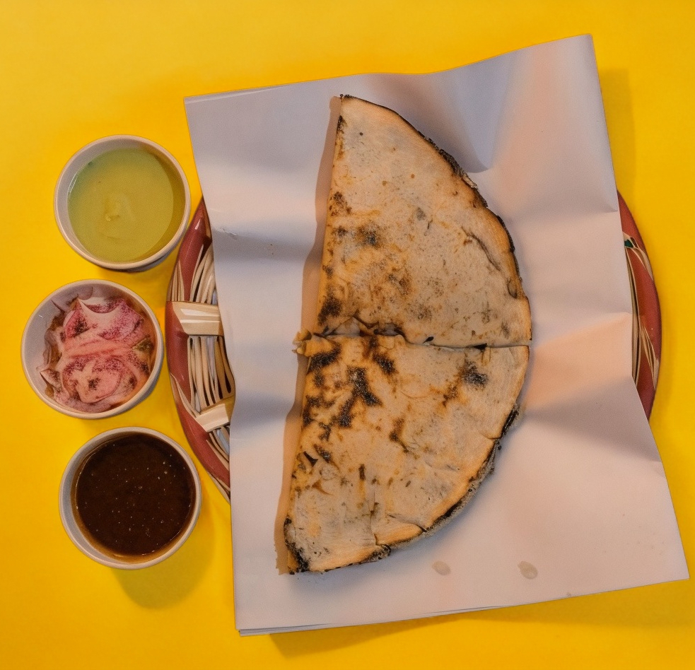Tortilla de maíz, aciento, frijol, verdura y quesillo.