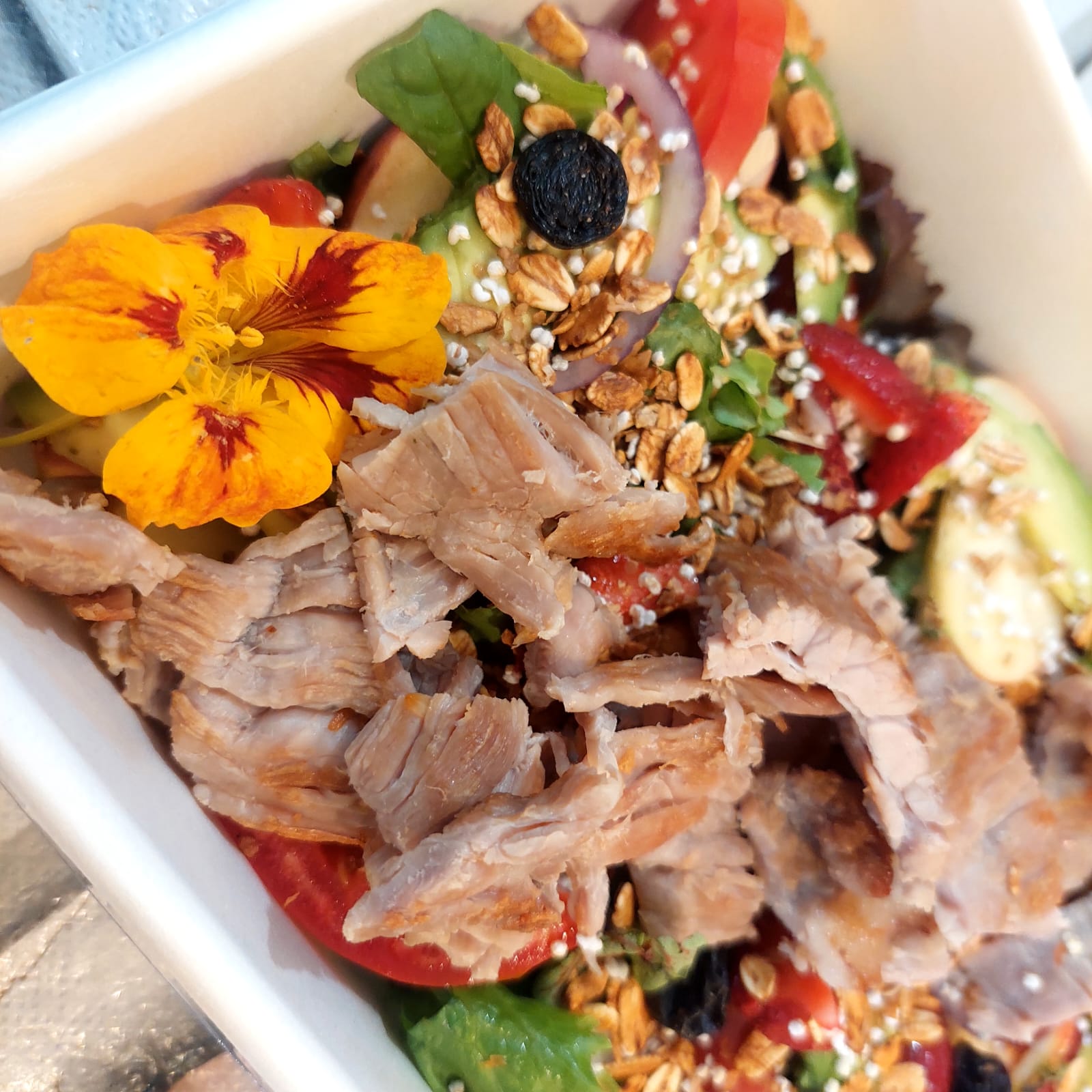 Mix de lechugas, tomate, cebolla, pepino, aguacate, manzana, fresa, granola, crotones, un aderezo y porción de tasajo
