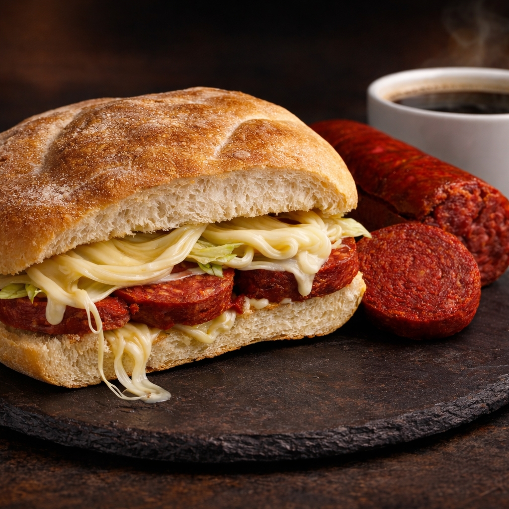 Torta de telera con salchicha roja oaxaqueña, quesillo, frijol molido, guacamole y salsa. Clásica y muy oaxaqueña.