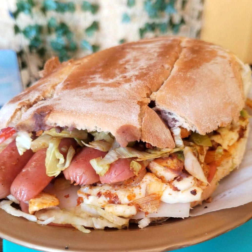 Preparada con pan telera, chorizo, quesillo, mayonesa, lechuga, tomate, aguacate, cebolla frita y chiles en vinagre.