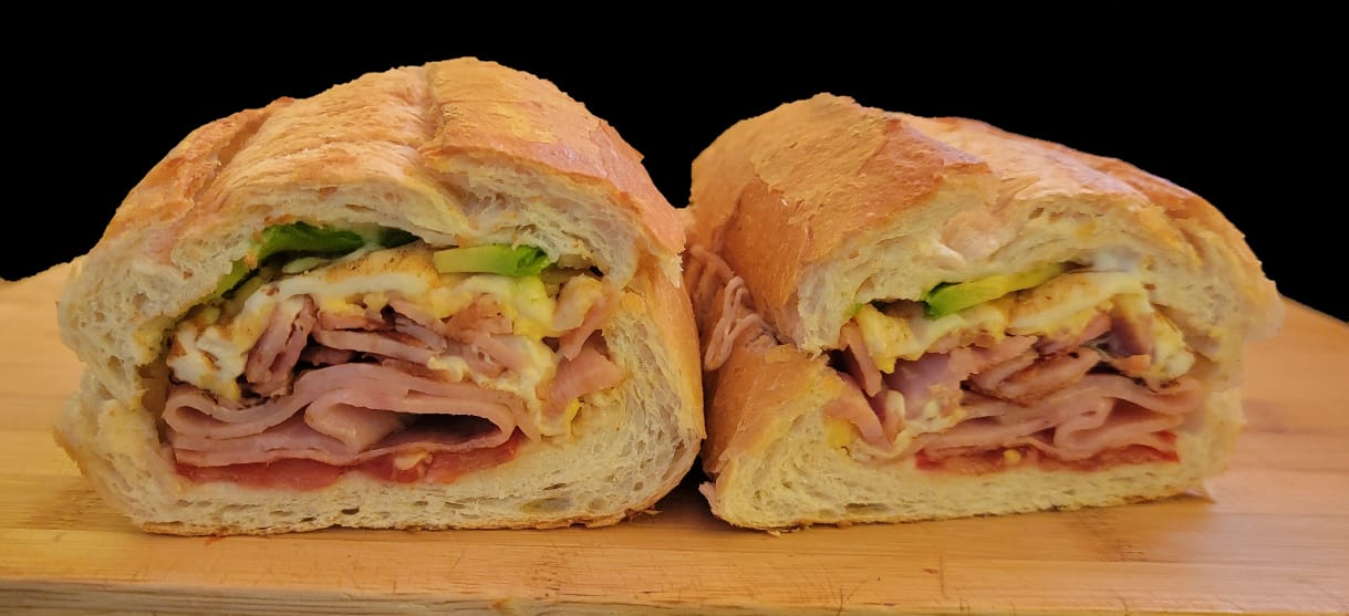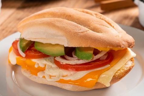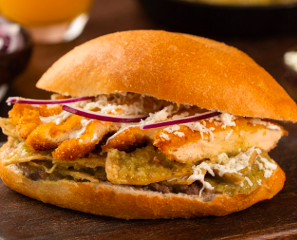 Torta de milanesa de pollo, quesillo, jitomate, aguacate, chiles en vinagre.