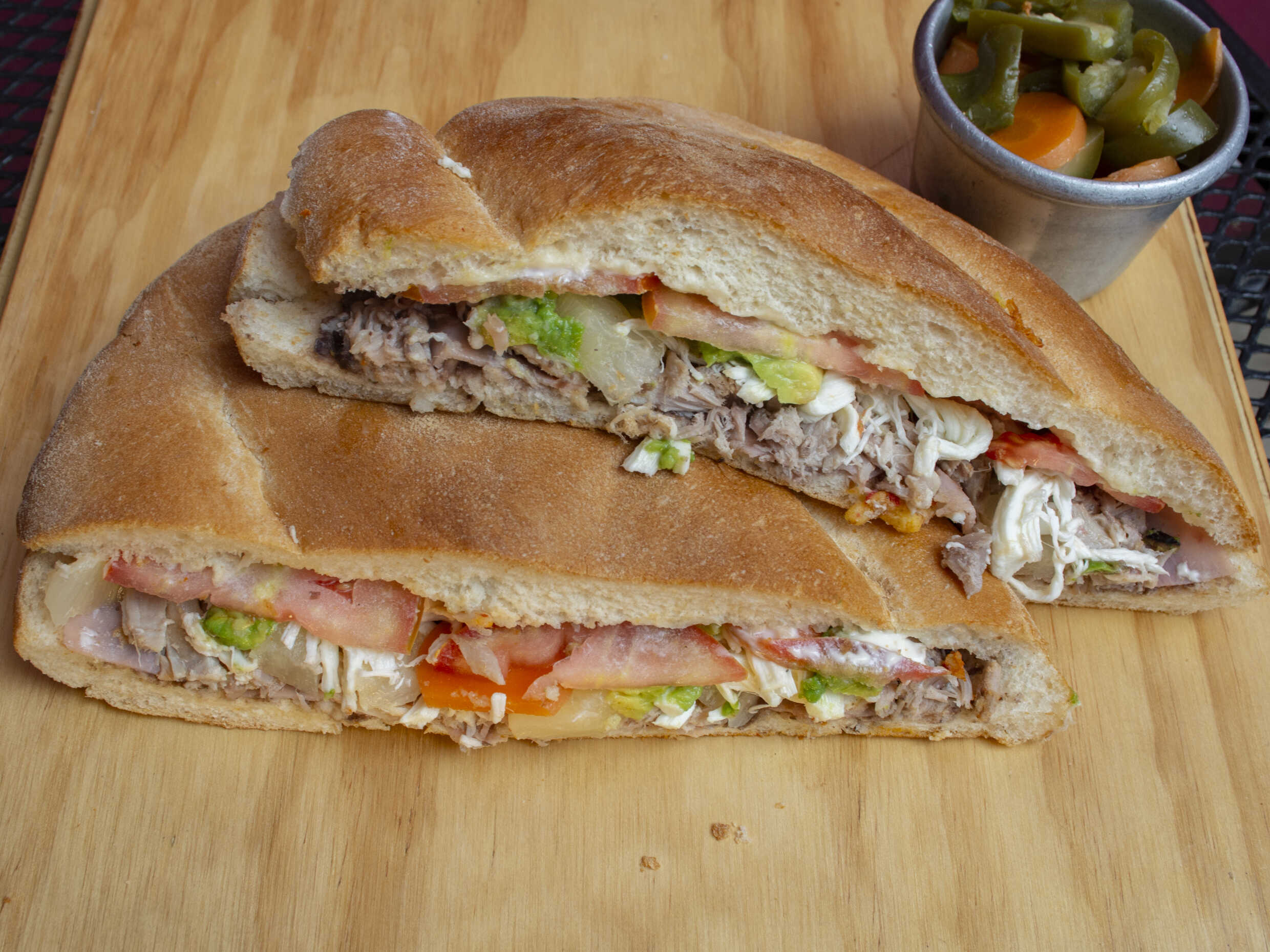 Pan artesanal con quesillo, queso manchego, queso crema, jamón, pechuga empanizada, tomate, aguacate, cebolla morada, lechuga y chiles en vinagre