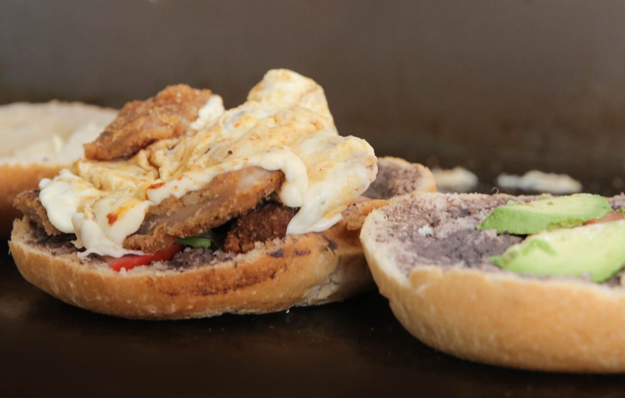 Torta de pollo con quesillo gratinado, aderezadas con nuestra pasta de frijol, mayonesa y acompañada de aguacate, tomate y chiles en vinagre o salsa chipotle de la casa.
