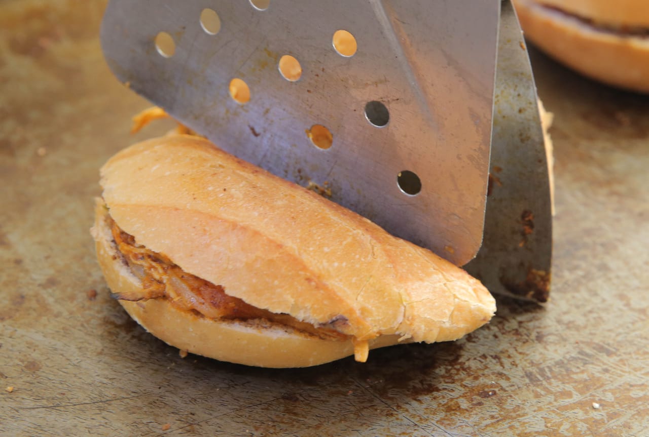 Torta de tasajo a la plancha con quesillo gratinado, aderezadas con nuestra pasta de frijol, mayonesa y acompañada de aguacate, tomate y chiles en vinagre o salsa chipotle de la casa.