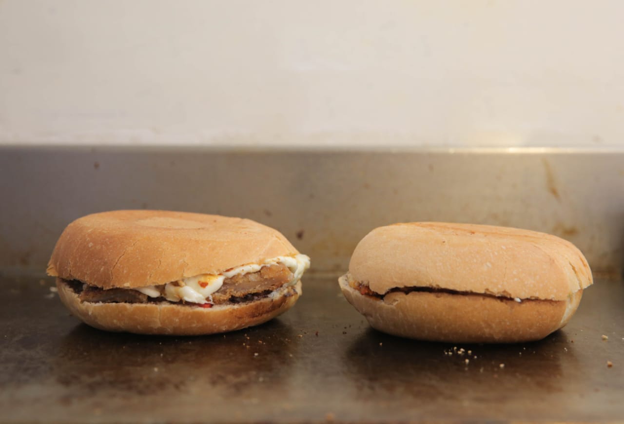 Torta de milanesa empanizada con quesillo gratinado, aderezadas con nuestra pasta de frijol, mayonesa y acompañada de aguacate, tomate y chiles en vinagre o salsa chipotle de la casa.