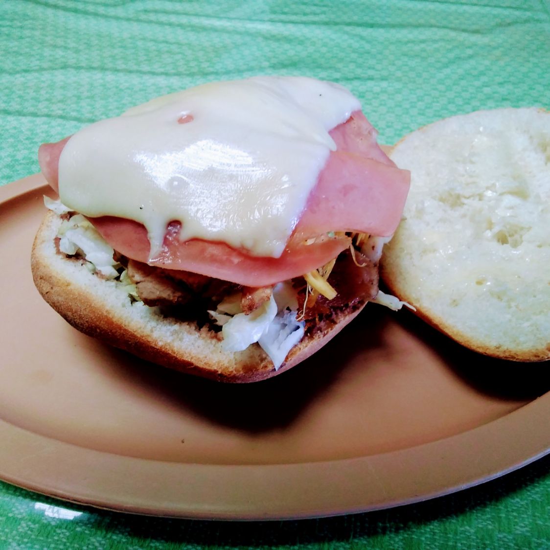 Pierna, quesillo fundido, queso amarillo y tocino