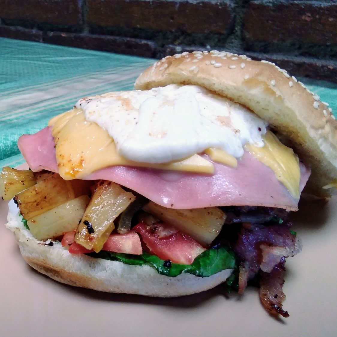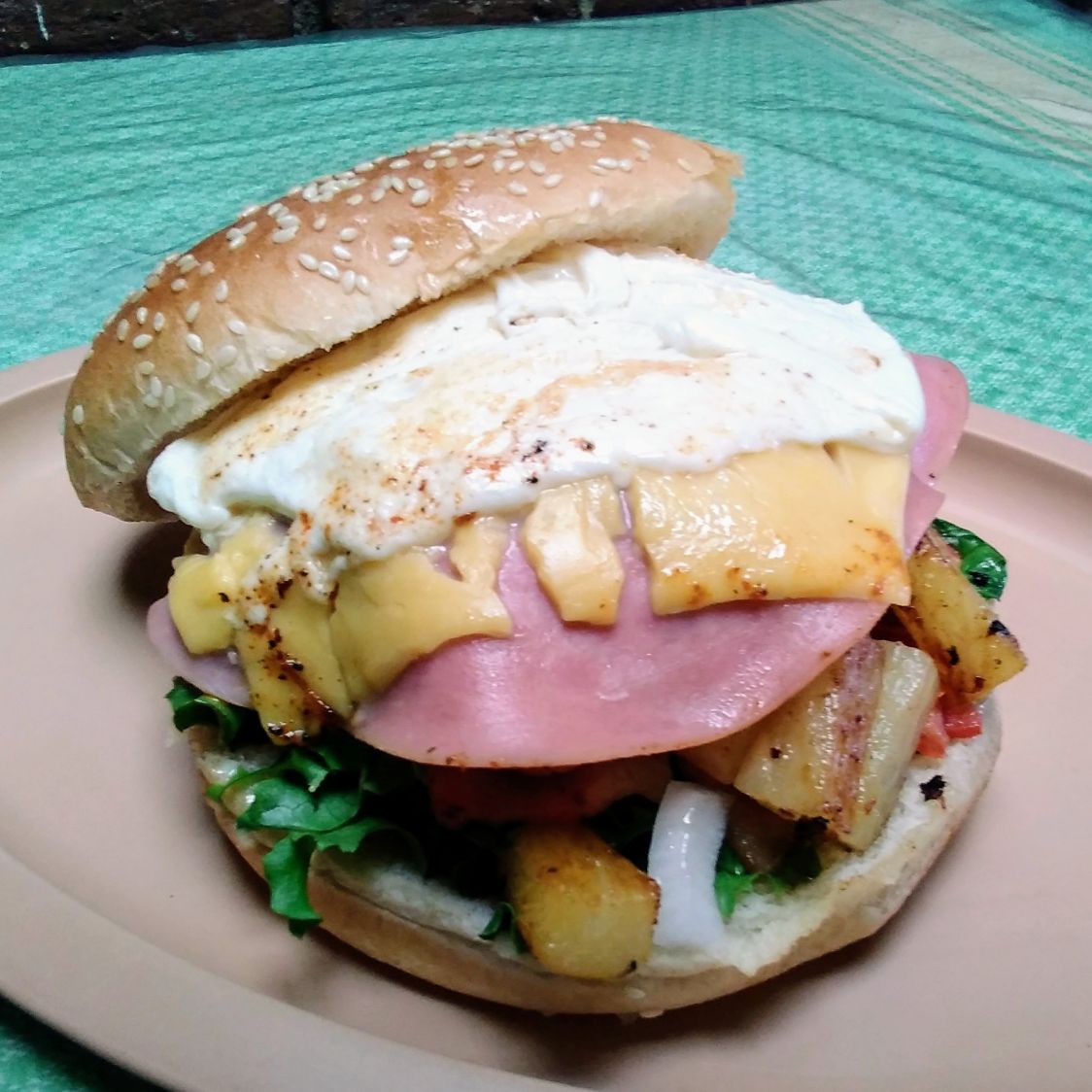 Carne de res, jamón, lechuga, tomate y cebolla