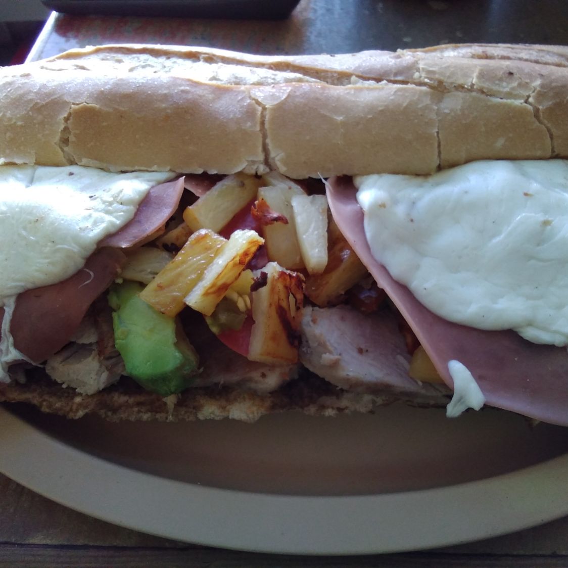 Pierna, jamón de pavo, quesillo fundido y piña
