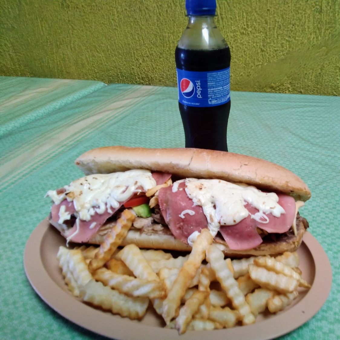 Carne de res, jamón, queso amarillo, quesillo, lechuga, tomate y cebolla