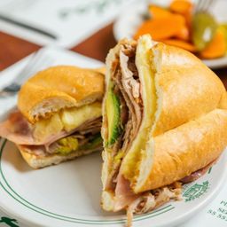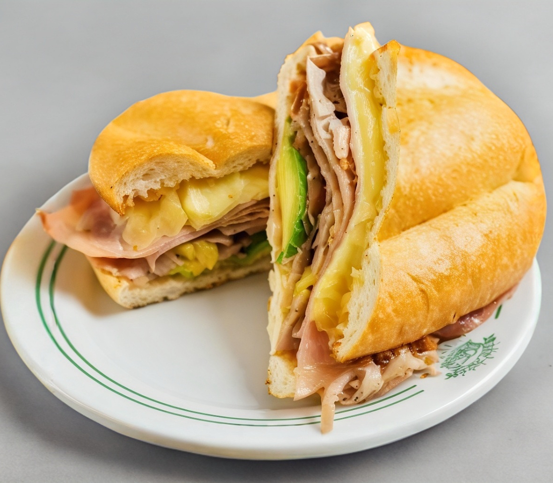 Mayonesa, guacamole, tomate, cebolla, jamón de pavo,queso gouda y piña