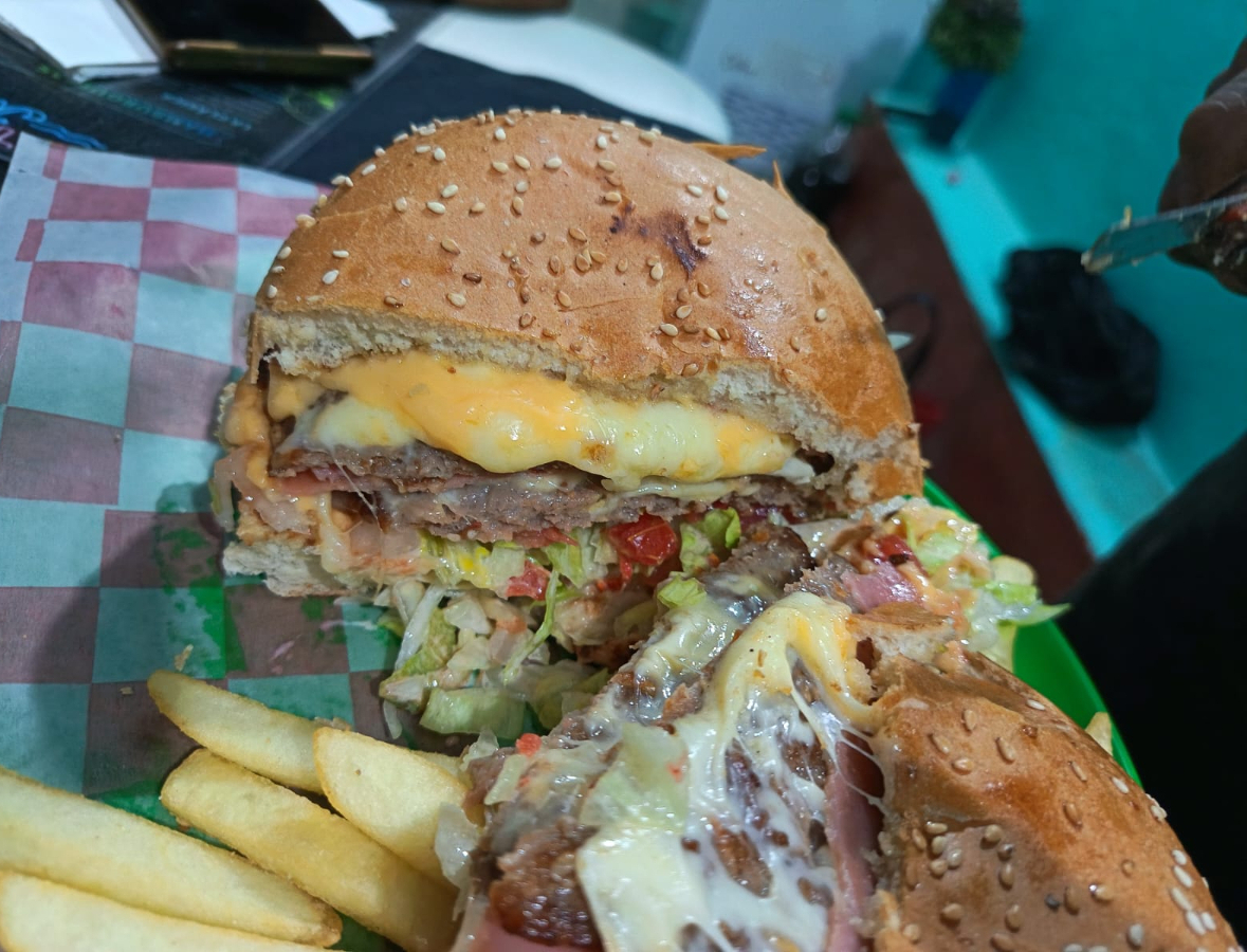 Doble carne de res, doble queso, doble jamón, verdura y aderezos.