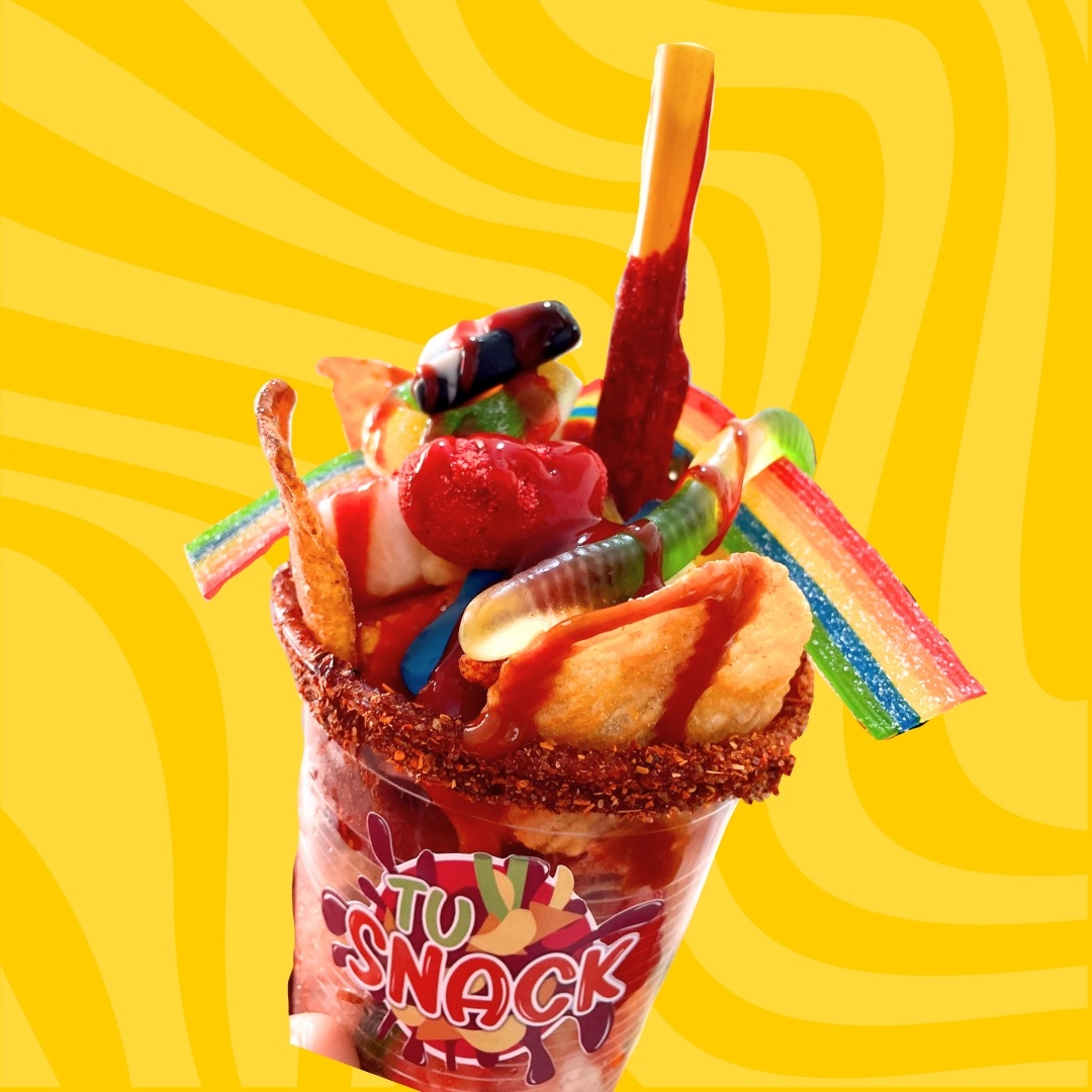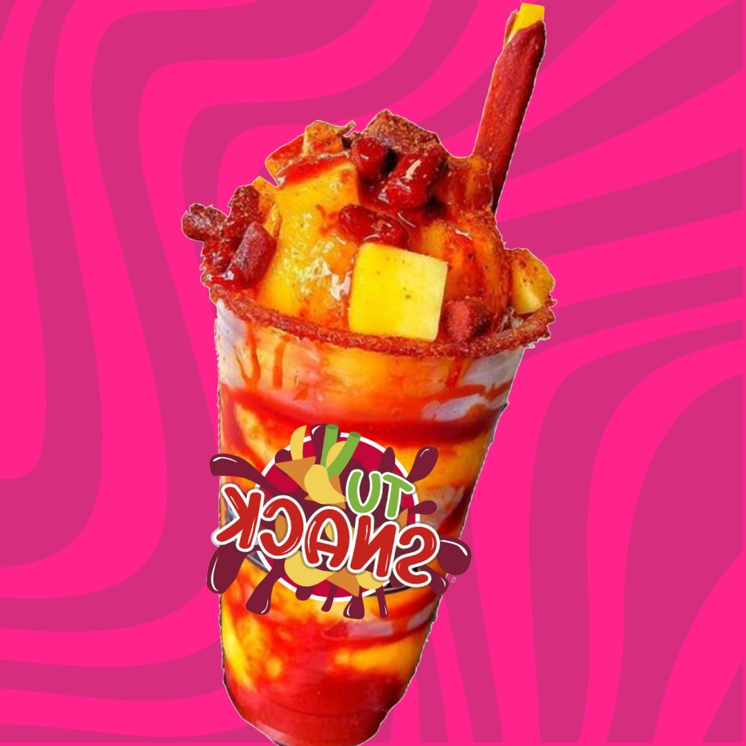 Smoothie de frappé de mango, chamoy especial, mango, gomitas y banderilla.