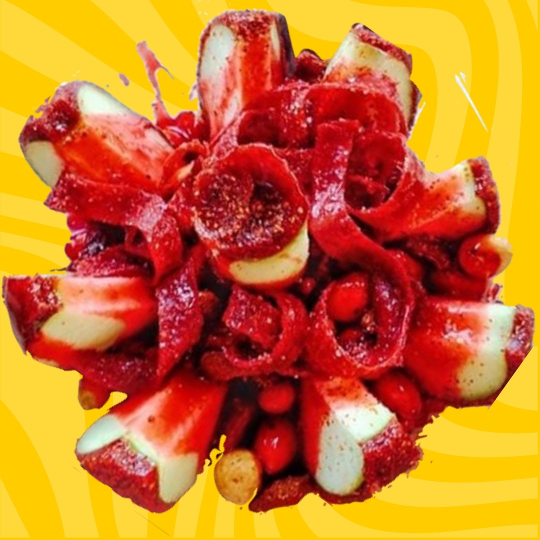 Fruta de temporada, gomitas variadas del día, cacahuates y papas Sabritas.