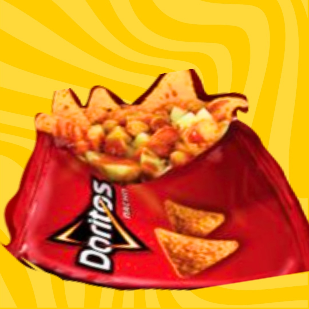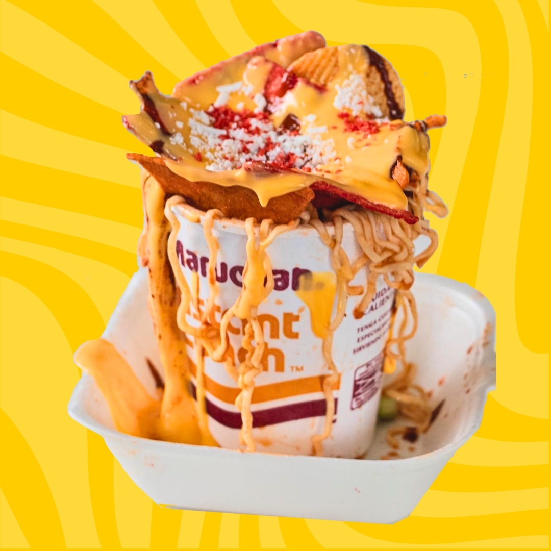 Maruchan preparada con Cheetos, Doritos y queso para nachos.