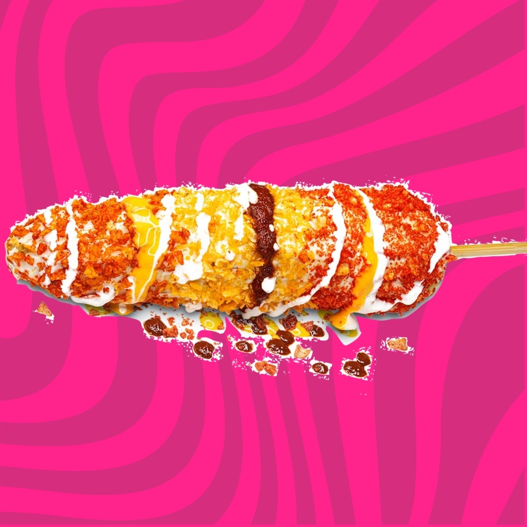 Elote cibierto de Doritos en polvo y mix de papas Sabritas.