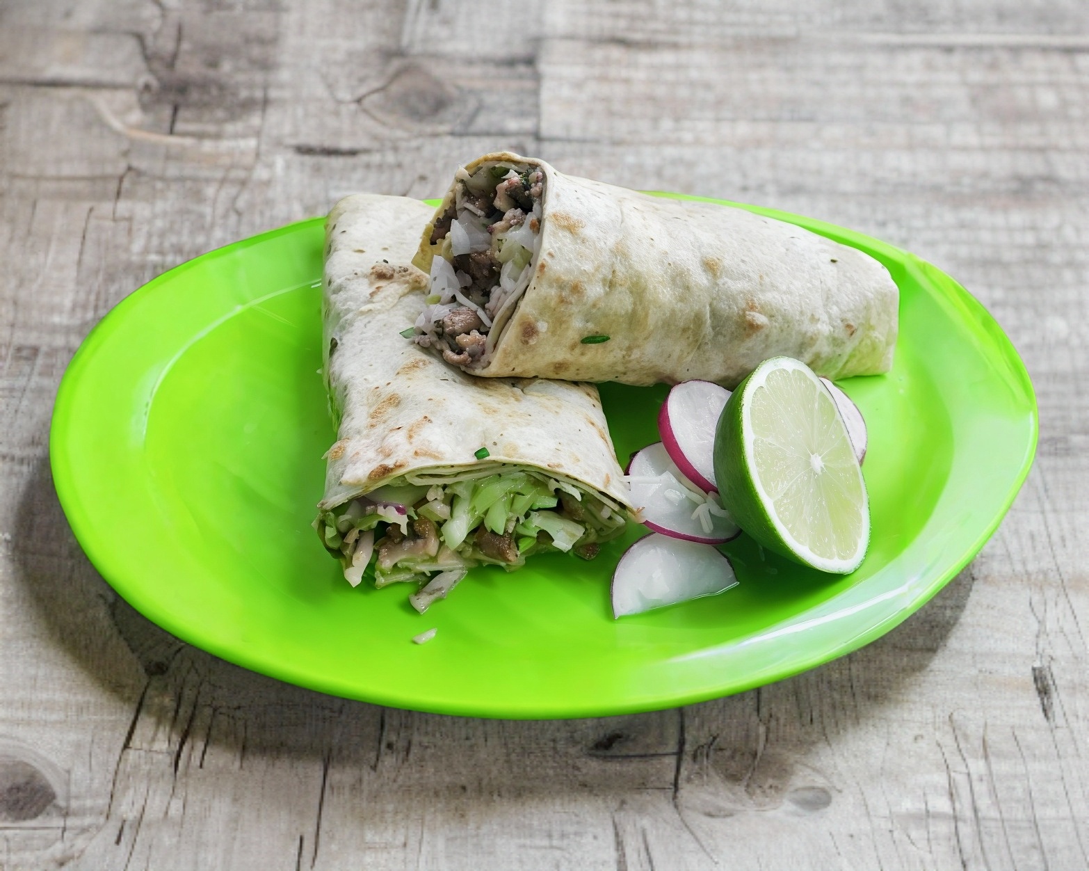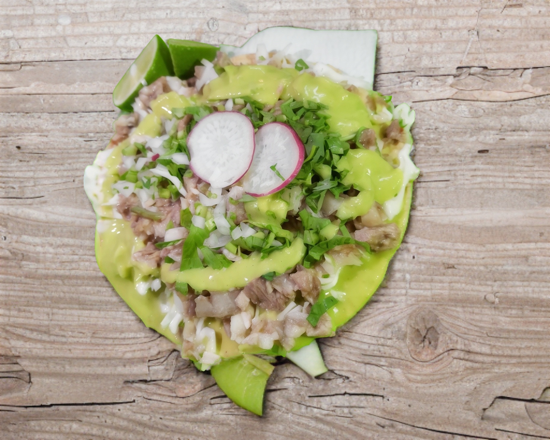 Col, cebolla, cilantro, rábanos, salsa verde o salsa roja habanero, guacamole y limones aparte.