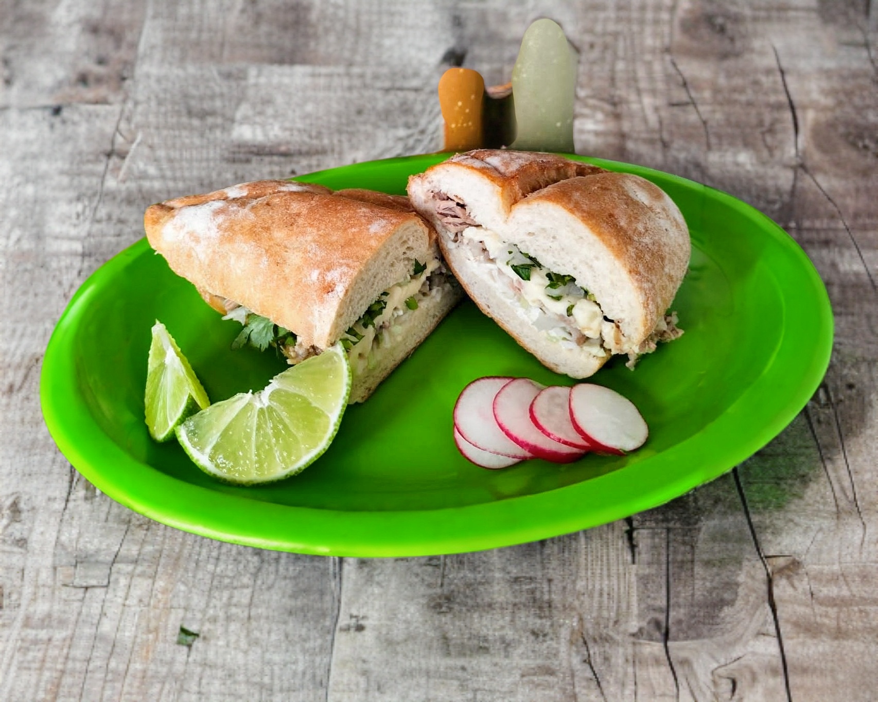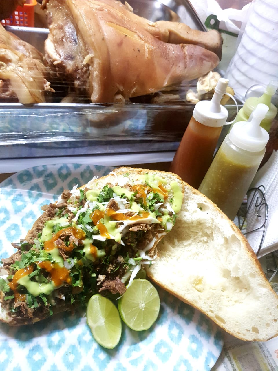 Quesillo, mayonesa, cilantro, cebolla, salsa verde o salsa roja habanero y limones aparte.