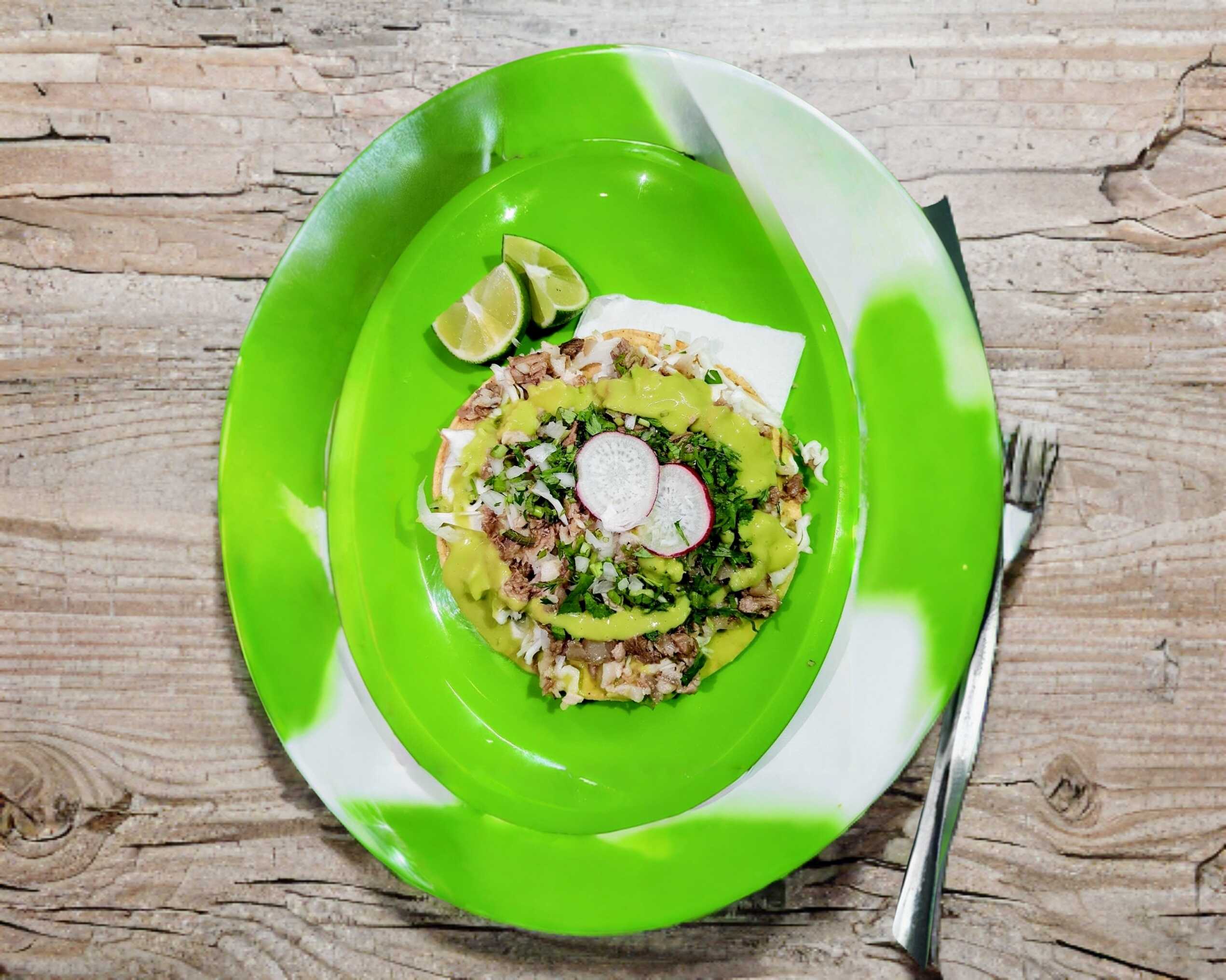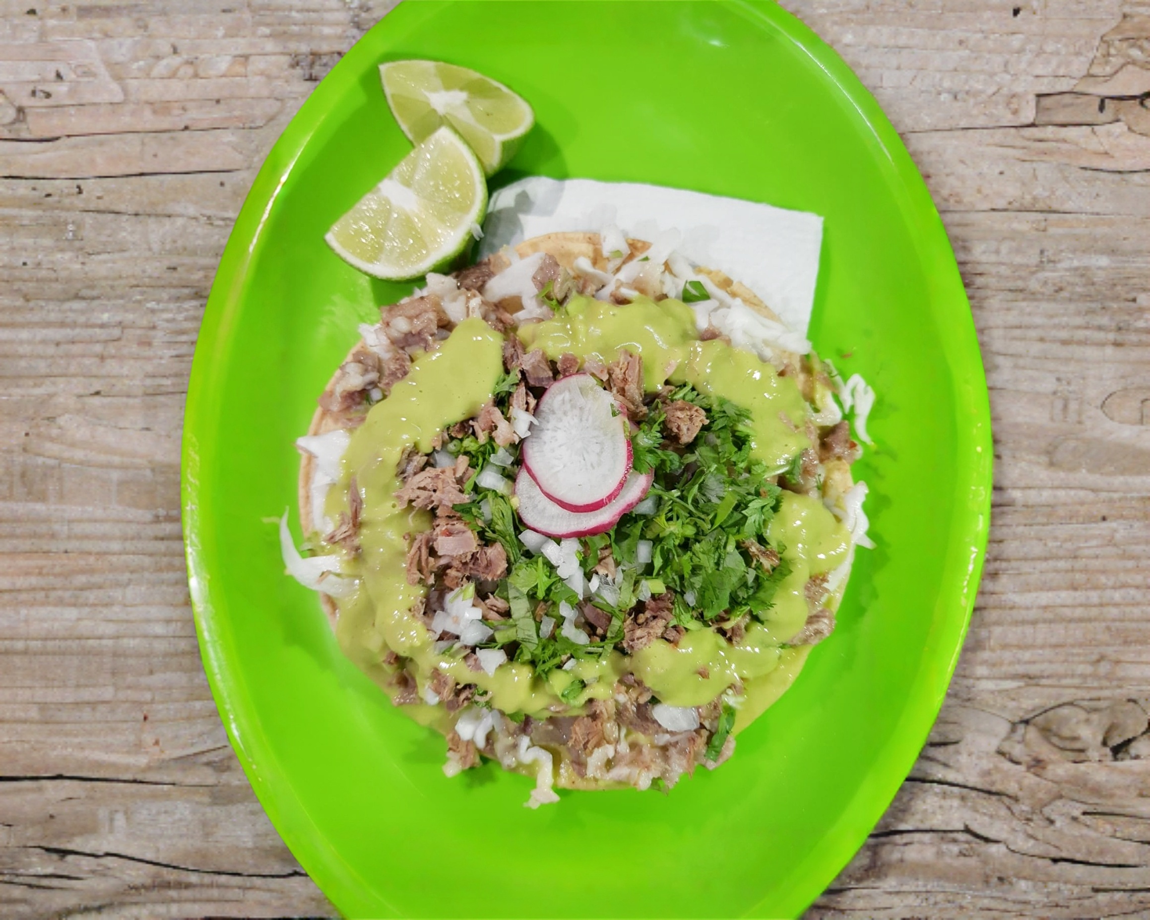 Col, cebolla, cilantro, rábanos, orégano, salsa verde o salsa roja habanero, guacamole y limones aparte, 4 tostadas fritas solas.
