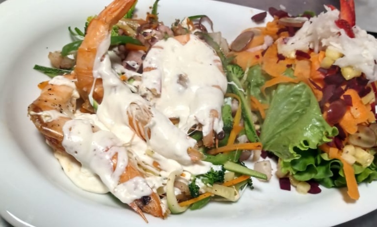 Camarones, trozos de filete de pescado y pulpo, a la plancha con verduras, cebolla morada y pimientos con quesillo gratinado, acompañado de ensalada, salsa, aderezo y tostadas.