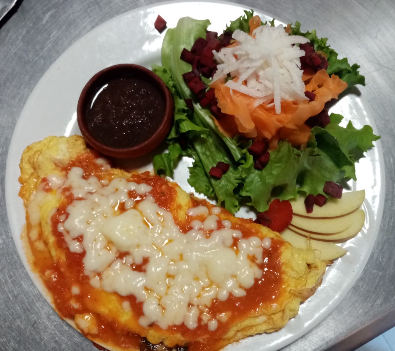 Omelette relleno de mozzarella, champiñones, tomate, albahaca, salsa italiana Pomodoro y queso parmesano, acompañado de ensalada, salsa, aderezo y tostadas.