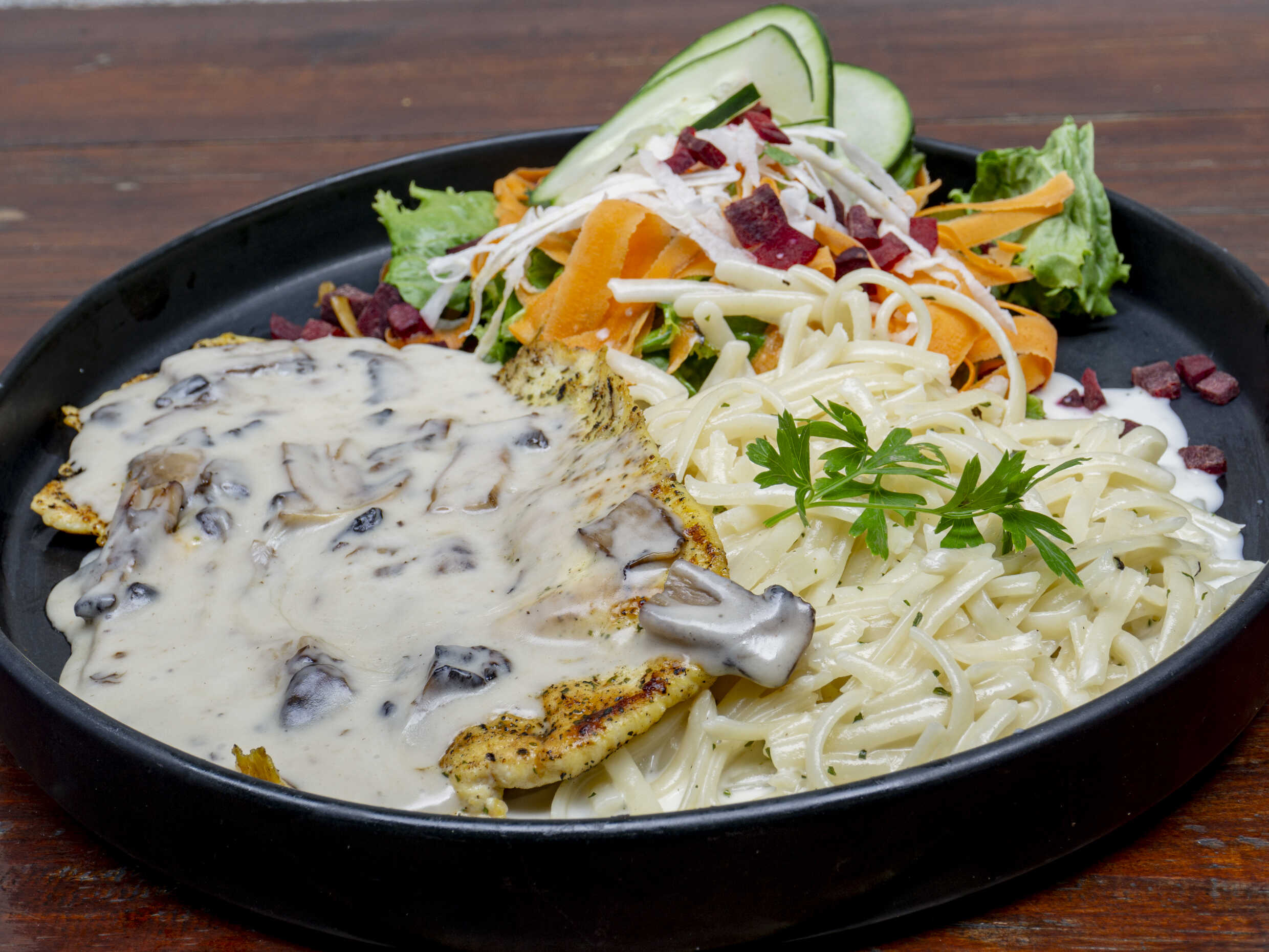 Pechuga grill gratinada con quesillo y champiñones, acompañada de spaghetti a la crema, ensalada, salsa, aderezo y tostadas.