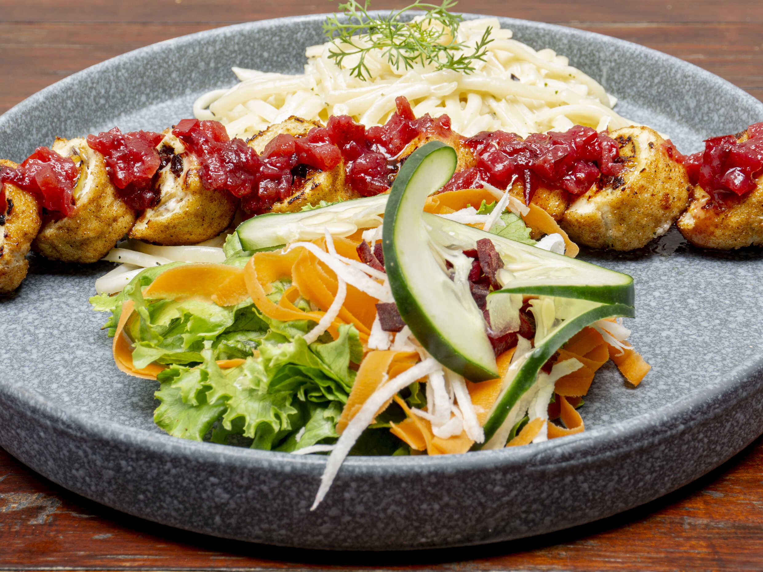 Relleno de queso de cabra, manzana, fresa, arándanos y garapiñados. Acompañada de spaghetti a la crema y ensalada. Salsa, aderezo y tostadas.