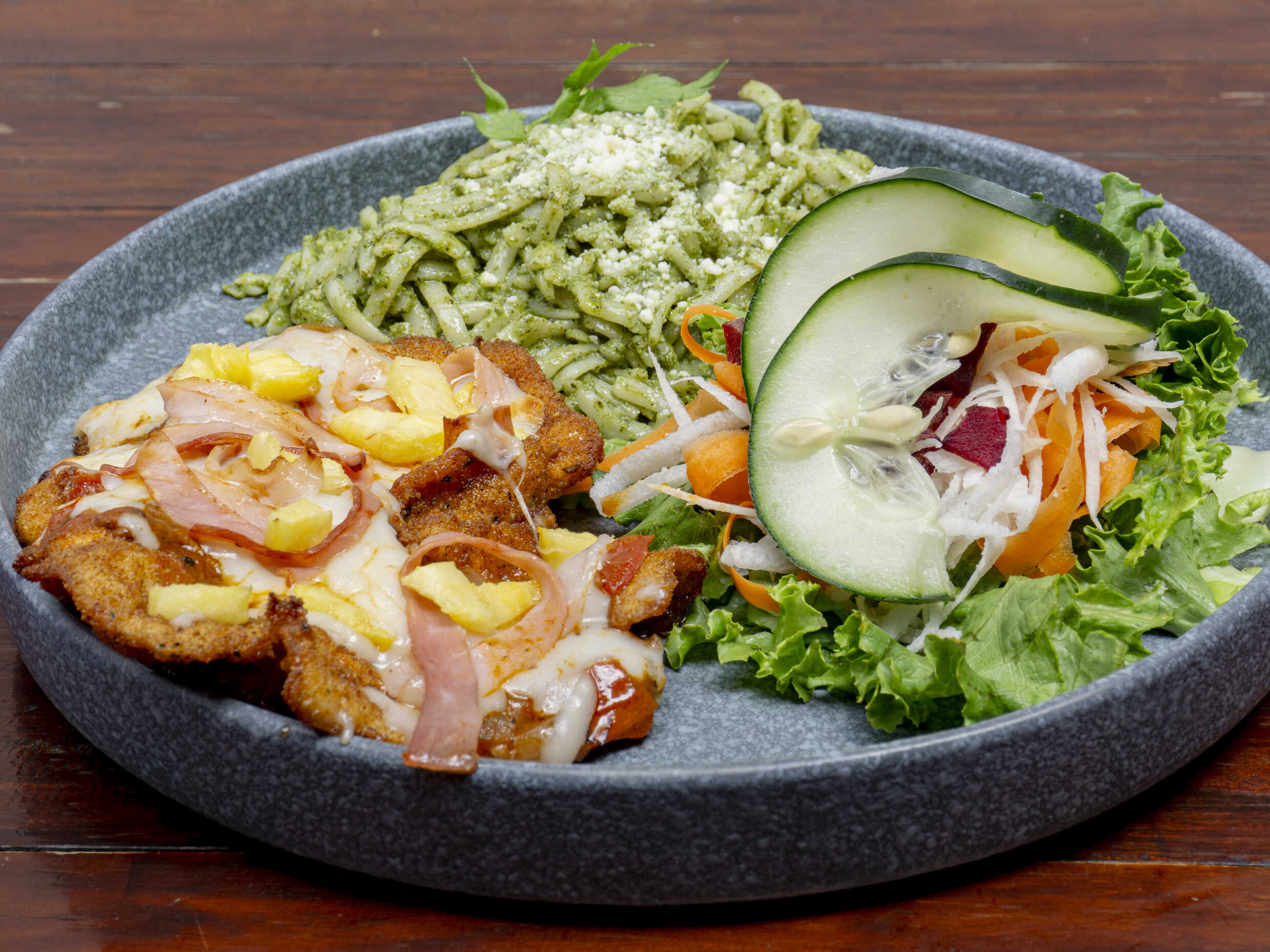 Pechuga empanizada, gratinada con tocino, queso mozzarella y piña, acompañada de papas gajo y ensalada. Salsa, aderezo y tostadas.